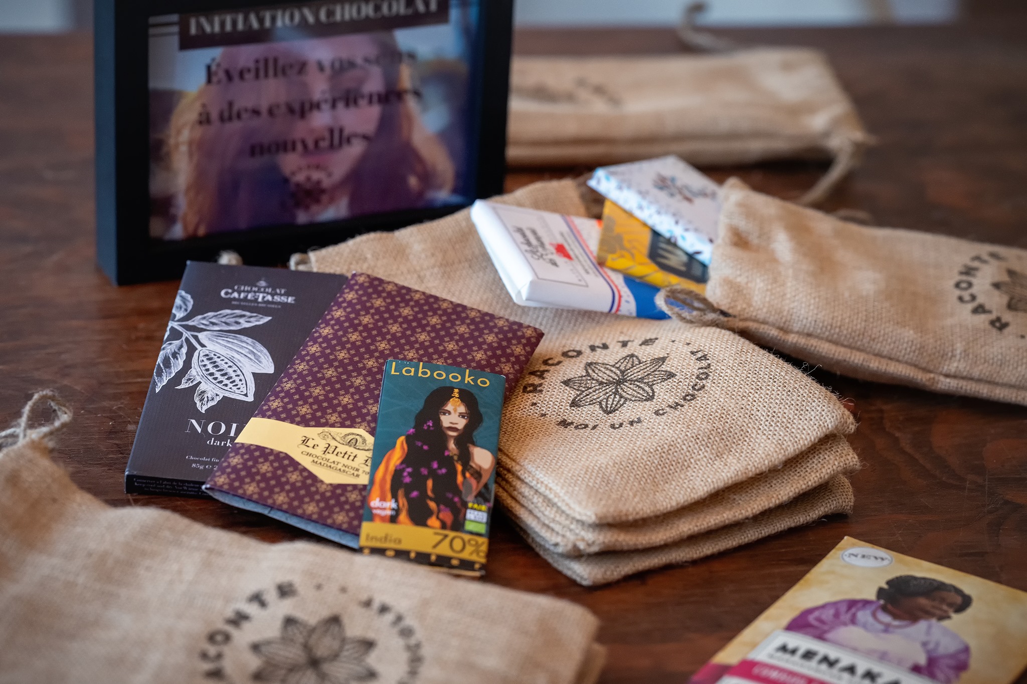 Dans chaque box, découvrez 3 tablettes de chocolat noir. Elles sont souvent vegan, au maximum bio, et toujours issues de productions durables et équitables. Les tablettes sont glissées dans un petit pochon en jute.
