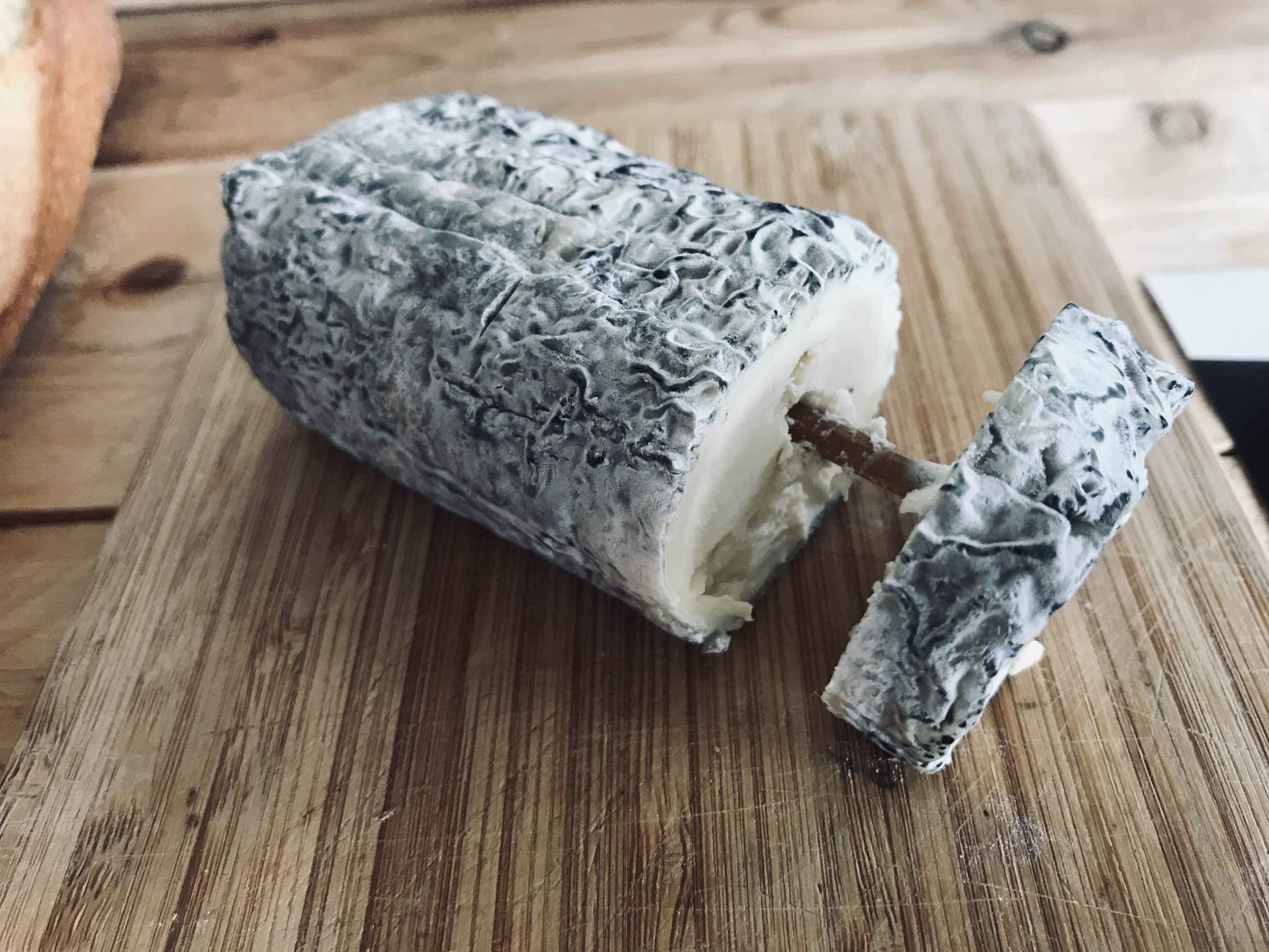 Ce fromage au lait de chèvre complète parfaitement la sélection de notre plateau. À l’intérieur, une paille de seigle le traverse pour éviter qu’il se casse. Sa croûte est fine et parsemée de charbon, ce qu’il lui donne une couleur bleue cendrée. Ce fromage est fondant en bouche, avec un léger goût de noisette. Excellent !