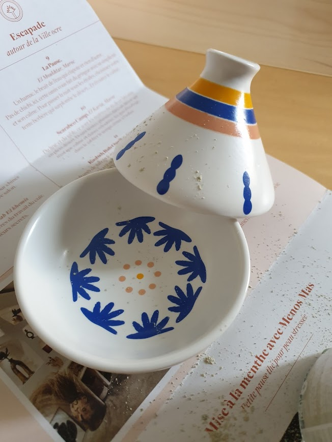 Enfin, la dernière touche de Maroc dans cette boite, le mini plat à Tajine, qui ne vous servira malheureusement pas à cuisiner un bon plat marocain mais qui pourra servir de vase ou bien de récipient pour préparer votre fameux masque exfoliant 😉 Certaines diront peut-être que c’est trop gadget mais je le trouve très mignon ce petit objet !