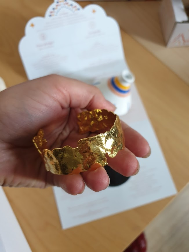 Une jolie manchette dorée aux effets un peu “cabossés”. Très sobre, il viendra facilement accompagné les petites robes légères qu’on espère bientôt porter !