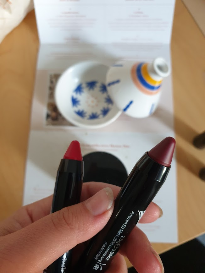 Les 2 teintes peuvent se porter ensemble ou séparément. L’un a un effet brillant, l’autre mate. La texture est vraiment superbe et les couleurs sont plutôt “classiques” ce qui permettra à chacune de s’y retrouver ! Le crayon se tourne pour faire remonter le baume, très pratique et original comme format !