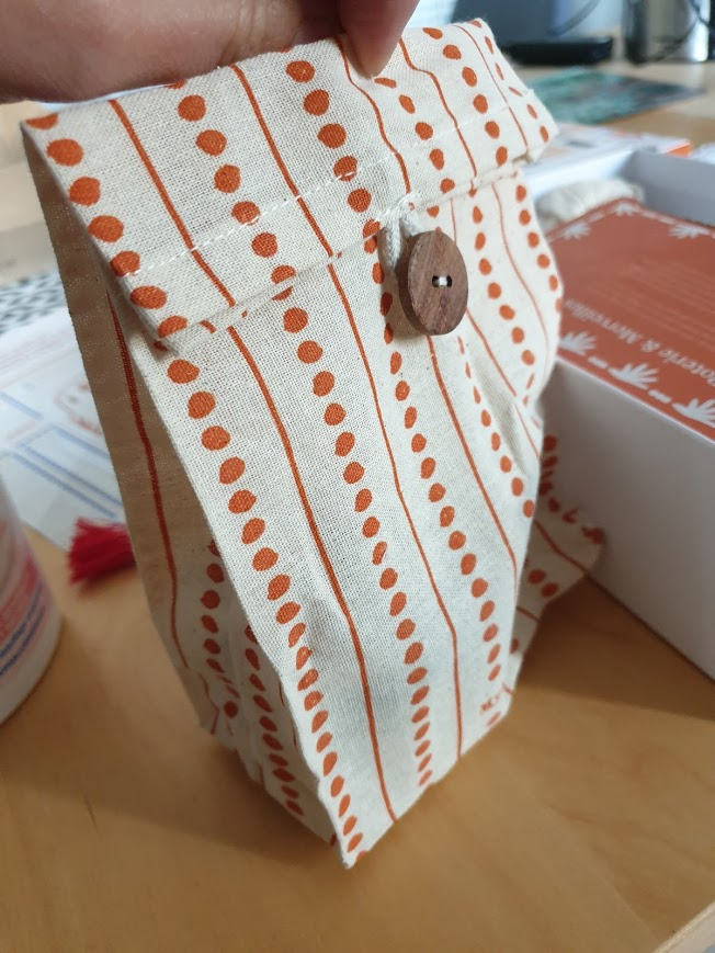 Comme chaque mois, nos produits de beauté sont soigneusement rangés dans un petit pochon de tissu. Ce mois ci il prend une forme un peu plus originale avec son rabat et son petit bouton à la place des habituels cordons. L’un de mes préférés !