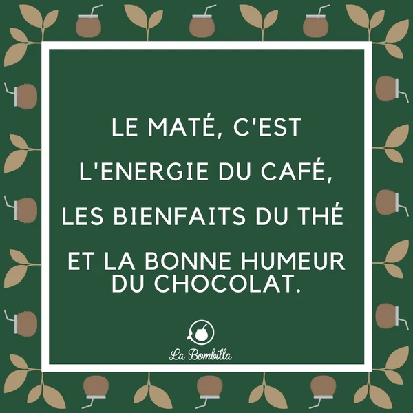 Le Yerba Maté est une boisson traditionnelle sud-américaine, préparée en infusant des feuilles de yerba maté. Du thé ? Pas vraiment. Du café ? Non plus ! Le maté est une boisson réputée pour ses bienfaits sur les performances cognitives (augmente la concentration, améliore la lutte contre la fatigue, soulage les maux de tête…). C’est aussi une boisson qui se consomme de manière particulière : en Argentine, le Maté se consomme selon la méthode traditionnelle dans une calebasse avec une bombilla (une sorte de pipette métallique avec un filtre à une extrémité qui permet de boire le maté sans aspirer les feuilles).
